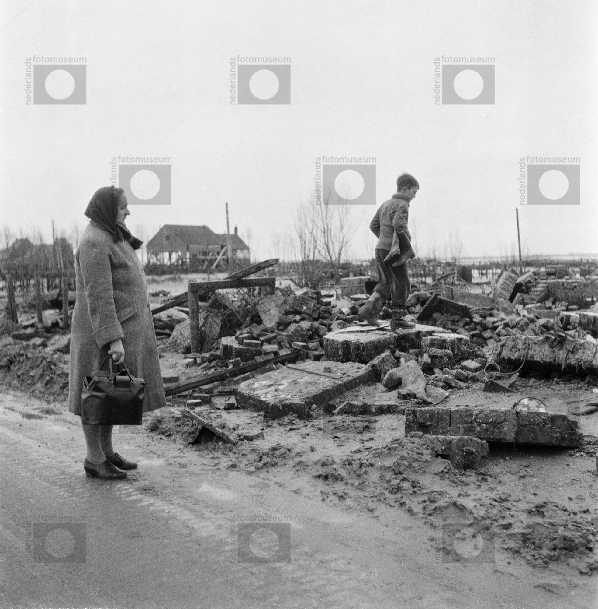 Vrouw en kind zoeken in puin, Schouwen, Zeeland (1954)