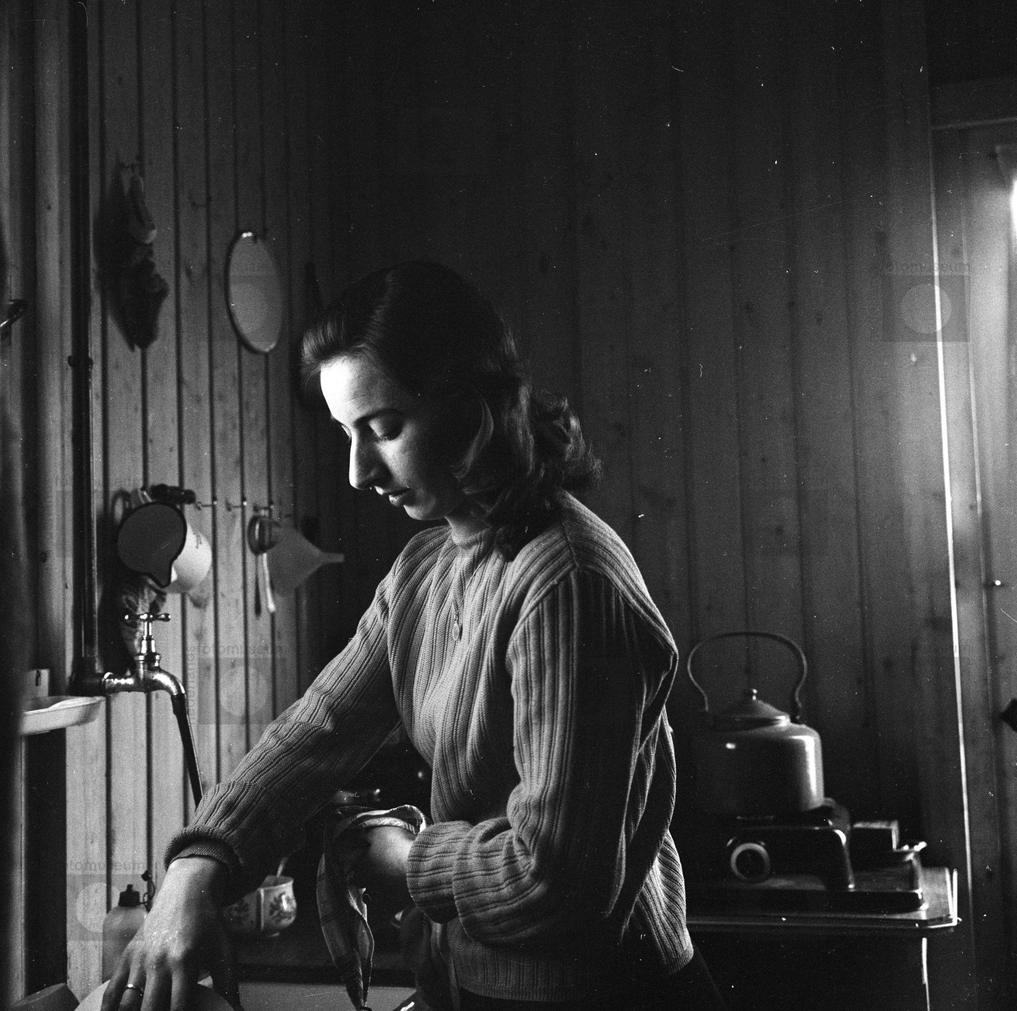 Vrouw wast af in de keuken van een barak, omgeving b...