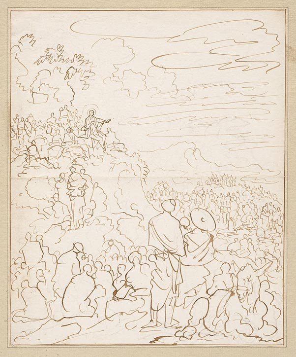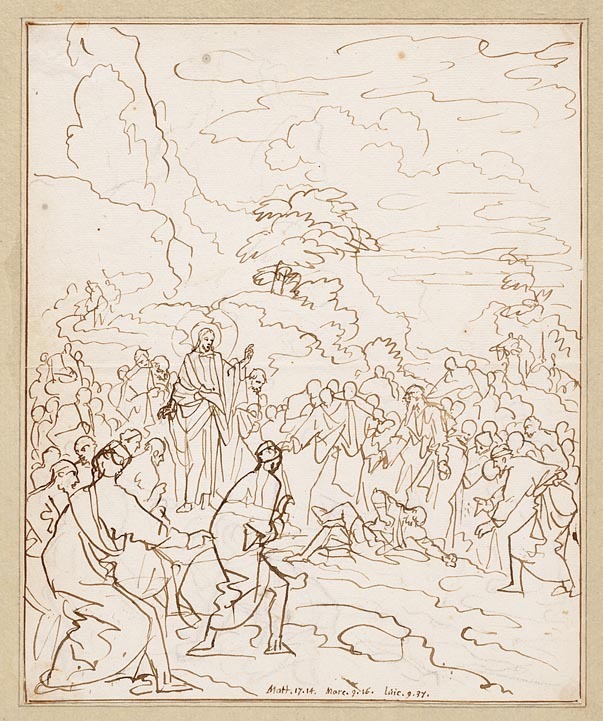 Jezus met vier discipelen op een hoogte, wenende ove...