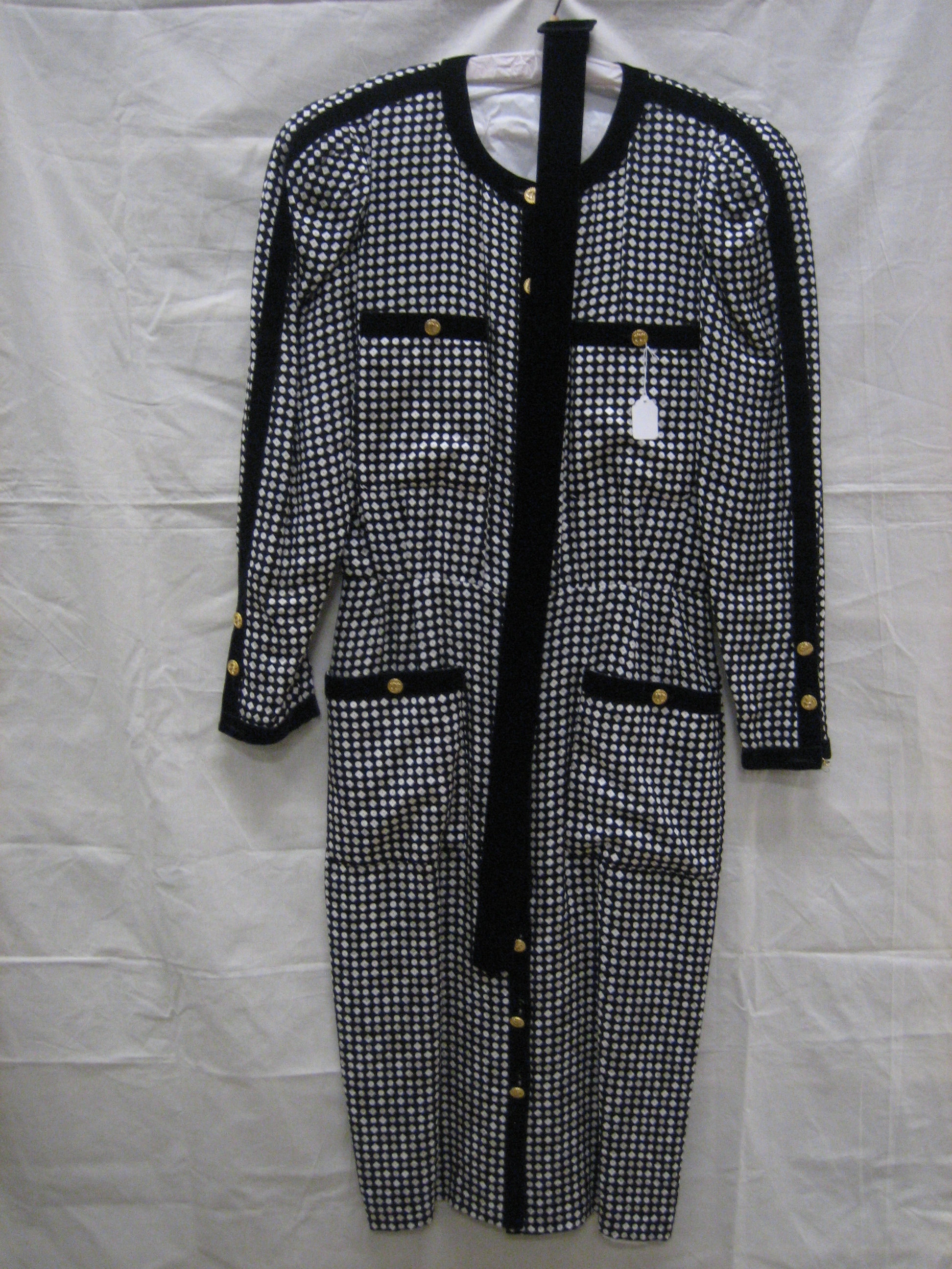 Jurk van bedrukte zijde in zwart/wit, afgebiesd met ...