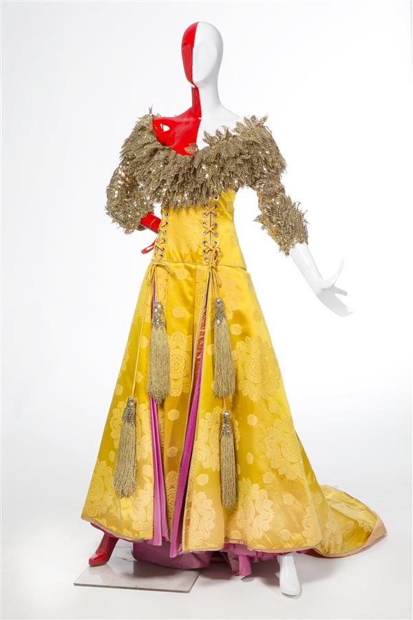 Trouwensemble bestaande uit trouwjurk, gele zijdedam...