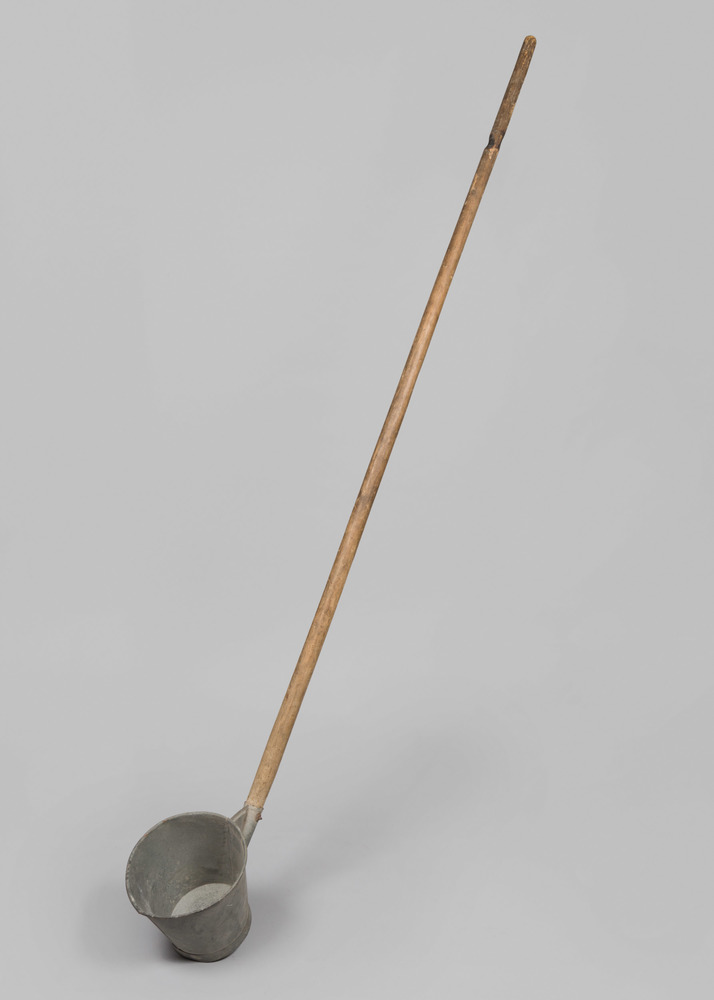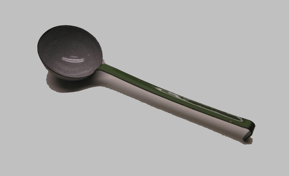 Pollepel geëmailleerd in grijs en groen, uit 1950