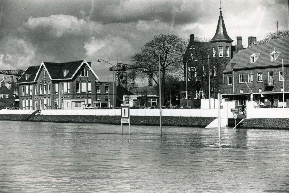 Zwart-wit foto van het hoogwater in Tolkamer in 1988