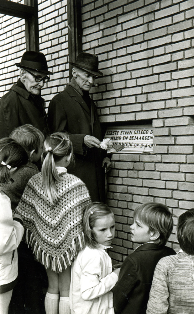 Zwart-wit foto van de eerste steenlegging van het do...