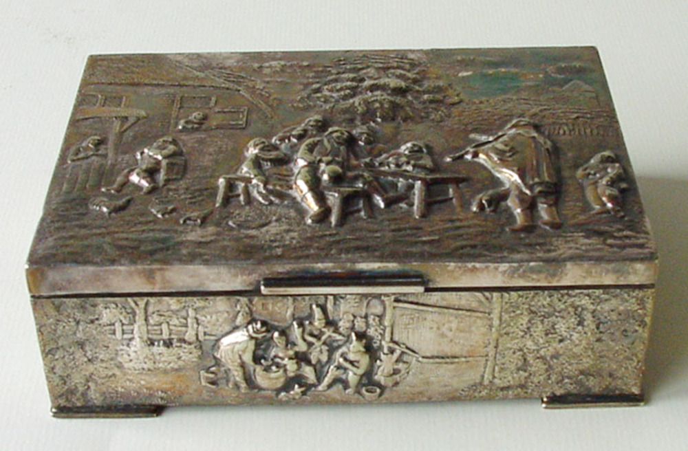 Sigarendoos van hout bekleed met metaal voorstellend...