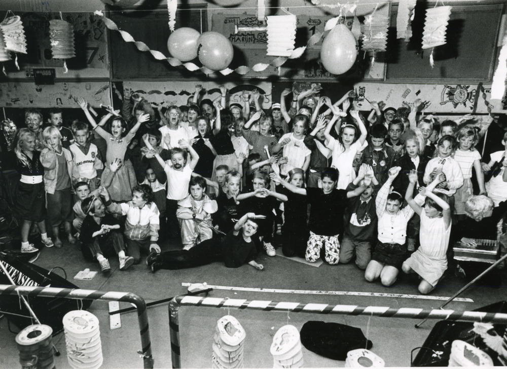 Zwart-wit foto van kinder en zang spelen bij E.M.M. ...