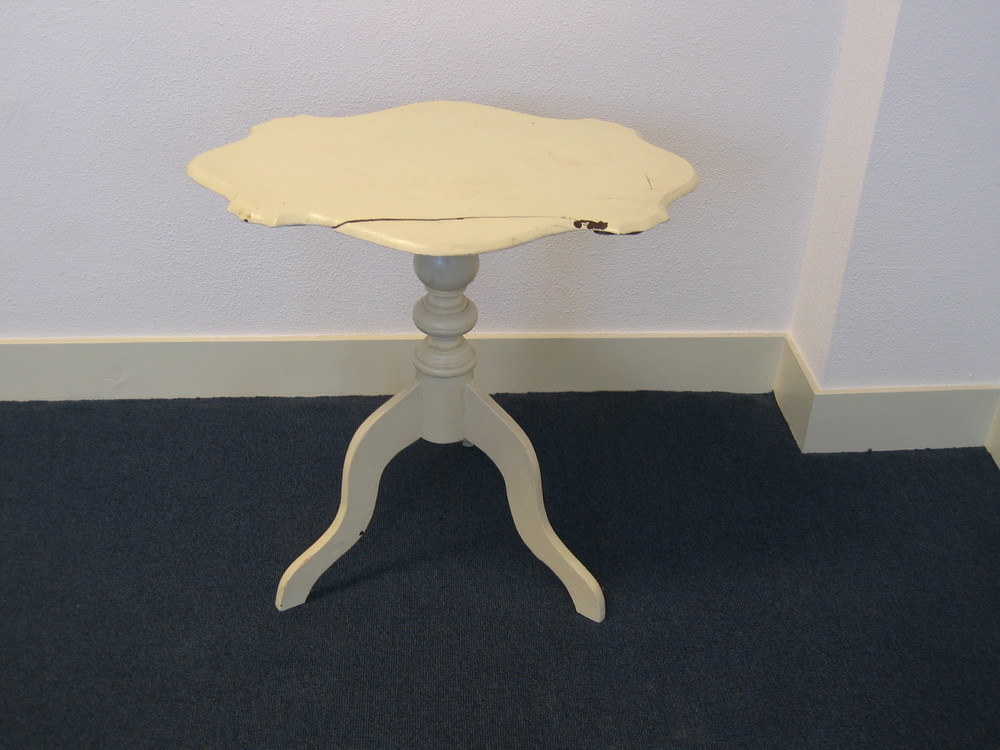 Wit houten tafeltje op driepoot met gegolfd bovenbla...