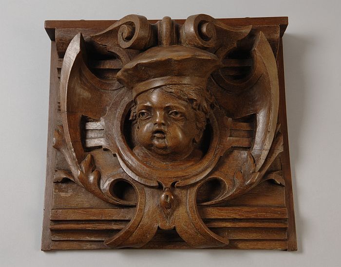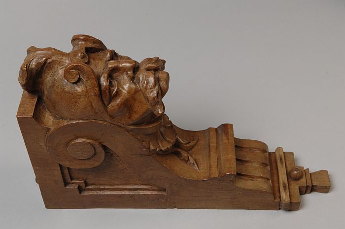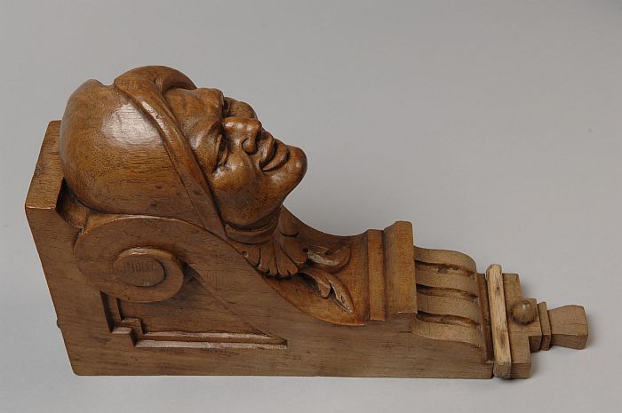 Gebeeldhouwde console met gesneden narrenhoofd, afko...