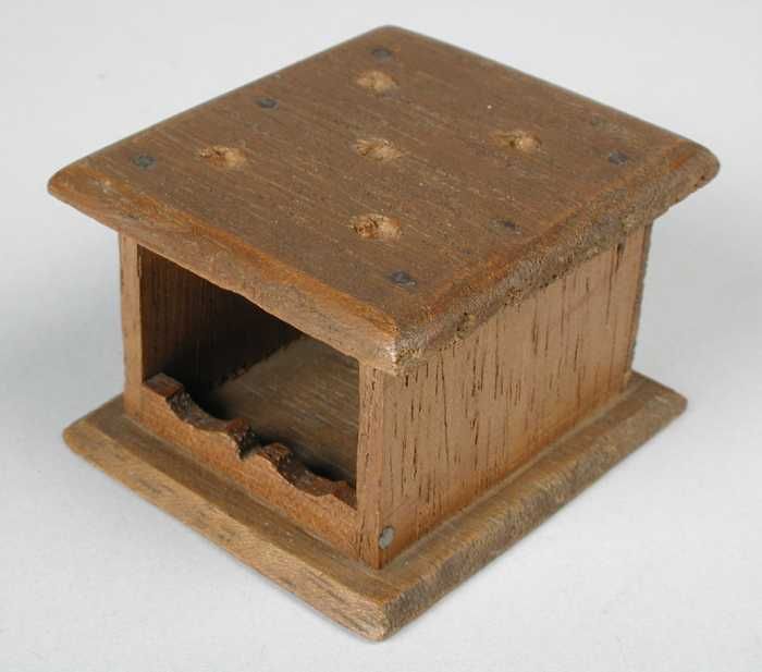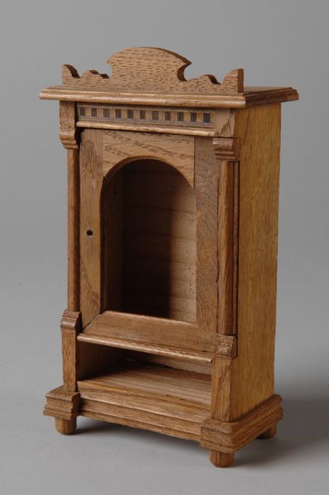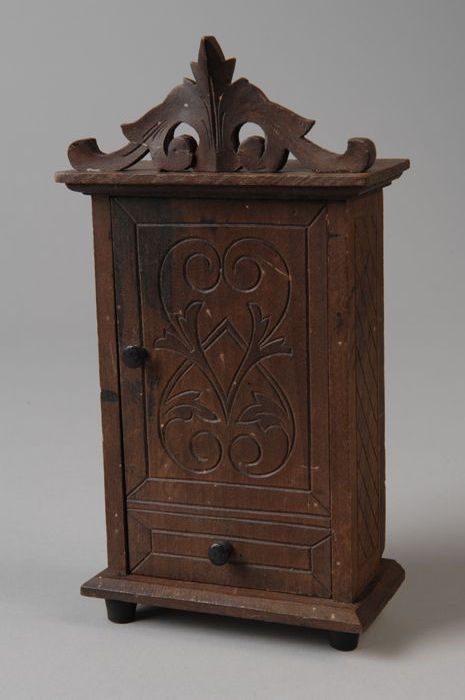 Houten miniatuur linnenkast met houtsnijwerk aan kui...