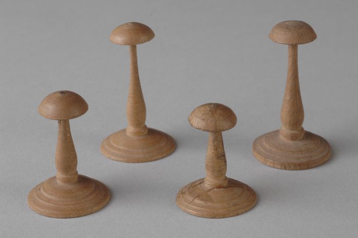 Vier gedraaide houten miniatuur hoedenstandaards, wa...