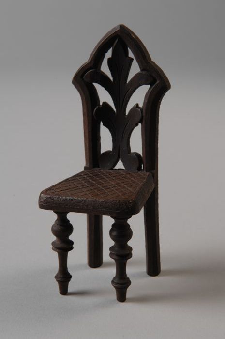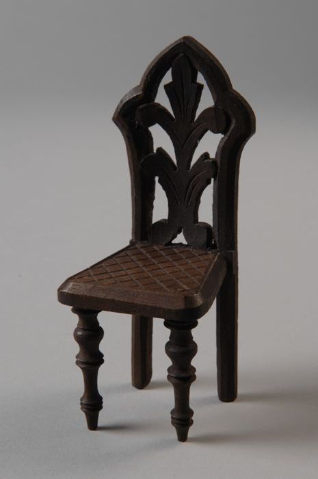 Houten miniatuur stoeltje met houtsnijwerk aan rugle...