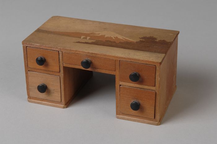 Houten miniatuur bureau met vijf laden, ingelegd (ma...