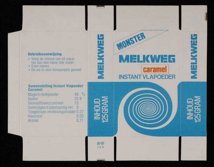 Ongevouwen wit en blauw, kartonnen pak "MELKWEG" vla...