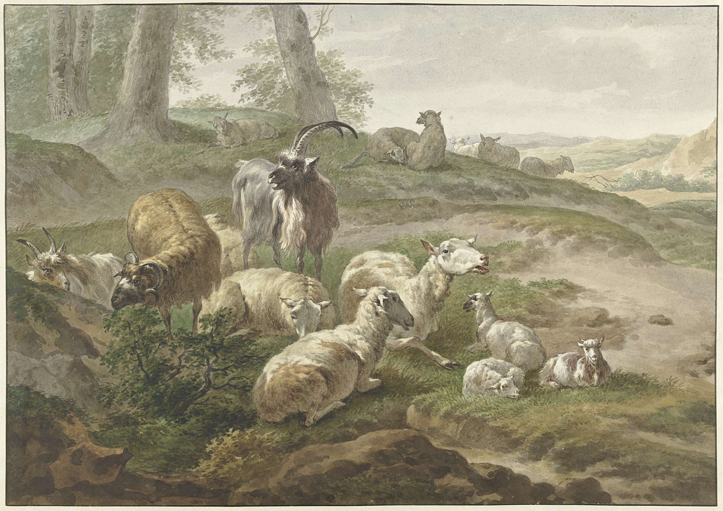 Bokken en schapen in een heuvelachtig landschap