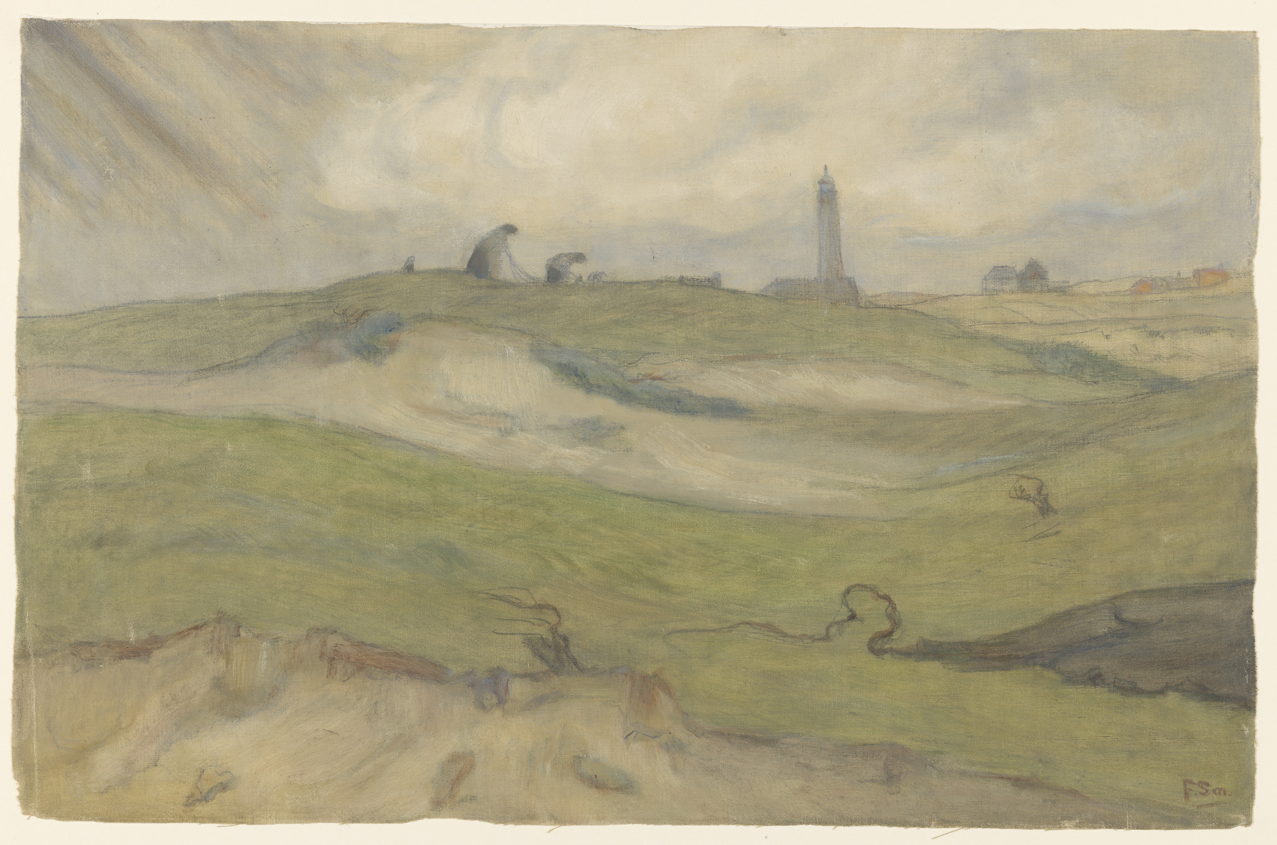 Duinlandschap met vuurtoren en nettenboeters