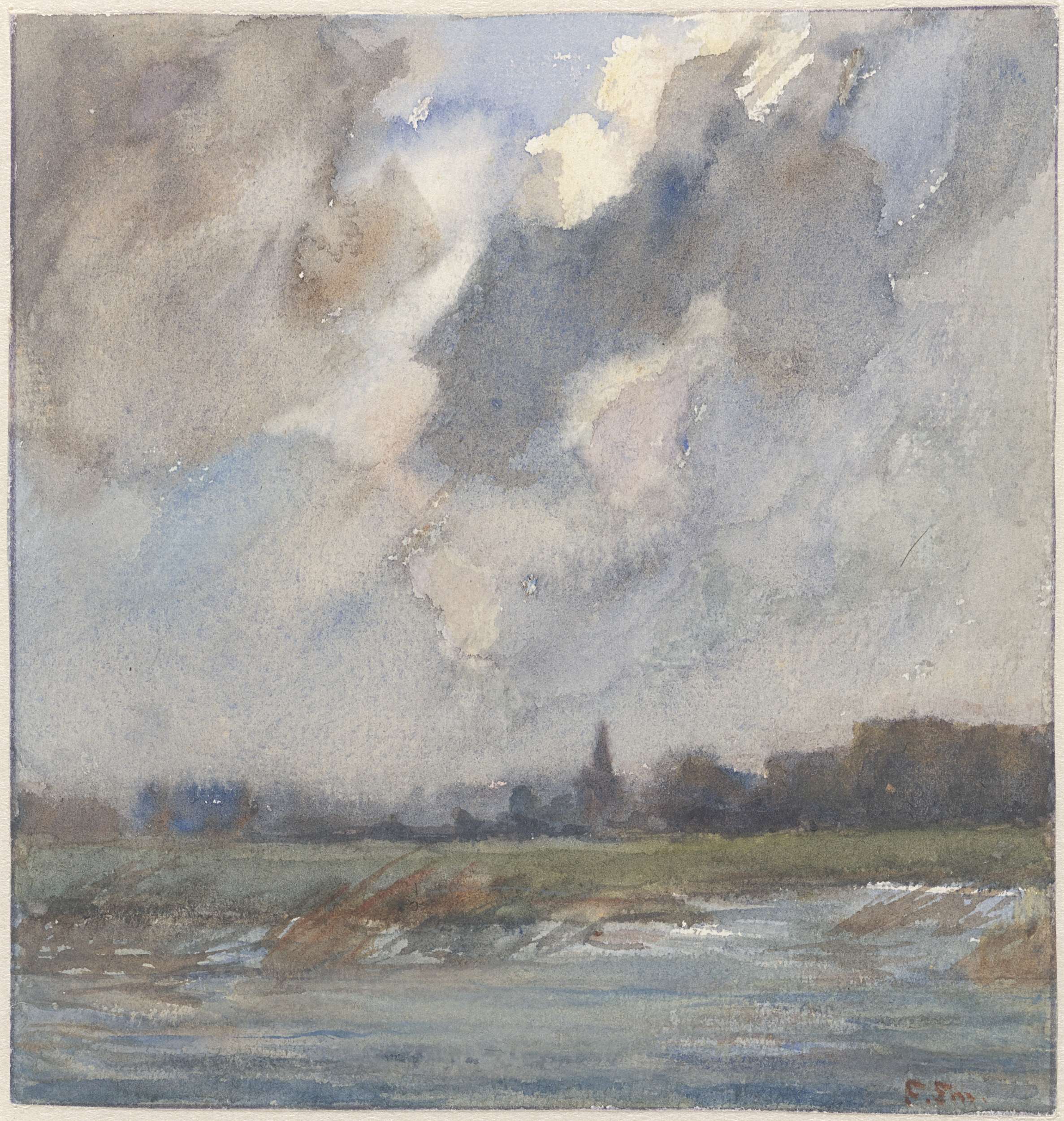 Rivierlandschap met kerktoren, bij storm
