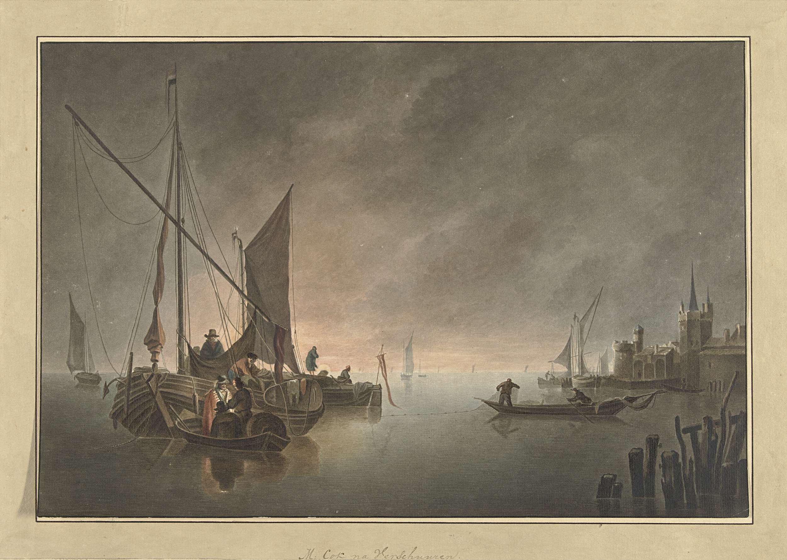 Schepen voor een omwalde stad bij ondergaande zon