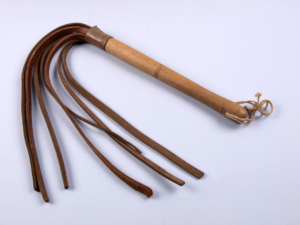 Zweep, houten steel met 6 leren riempjes