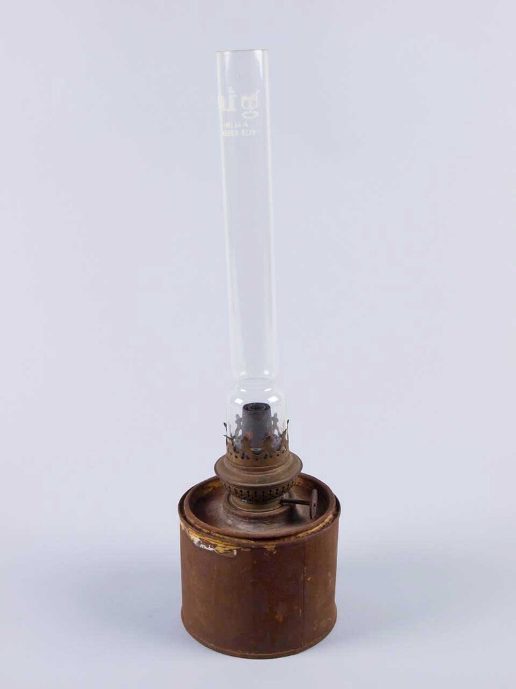 Petroleumlamp met als houder een conservenblik