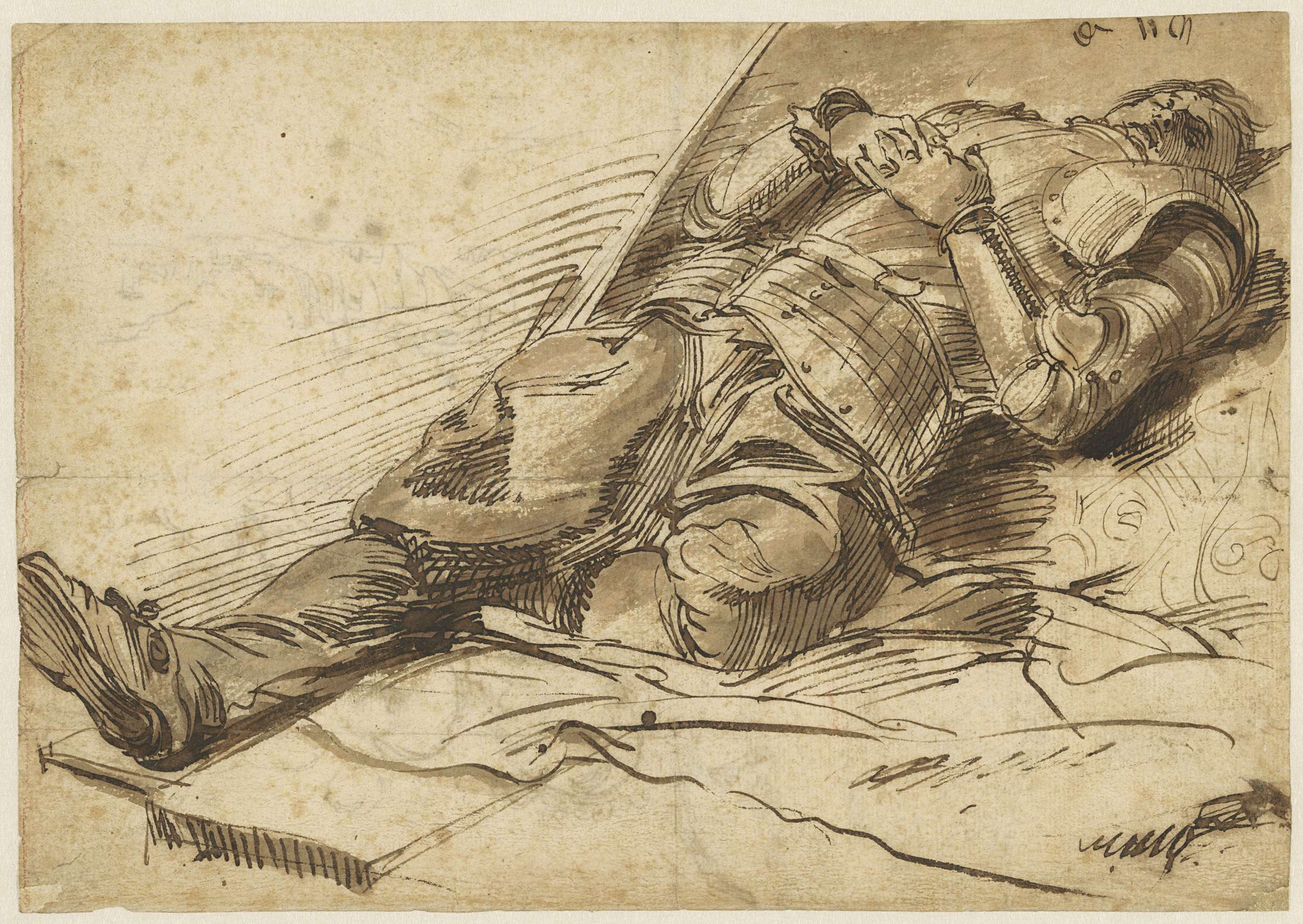 Op de rug liggende krijgsman in harnas, met gevouwen...