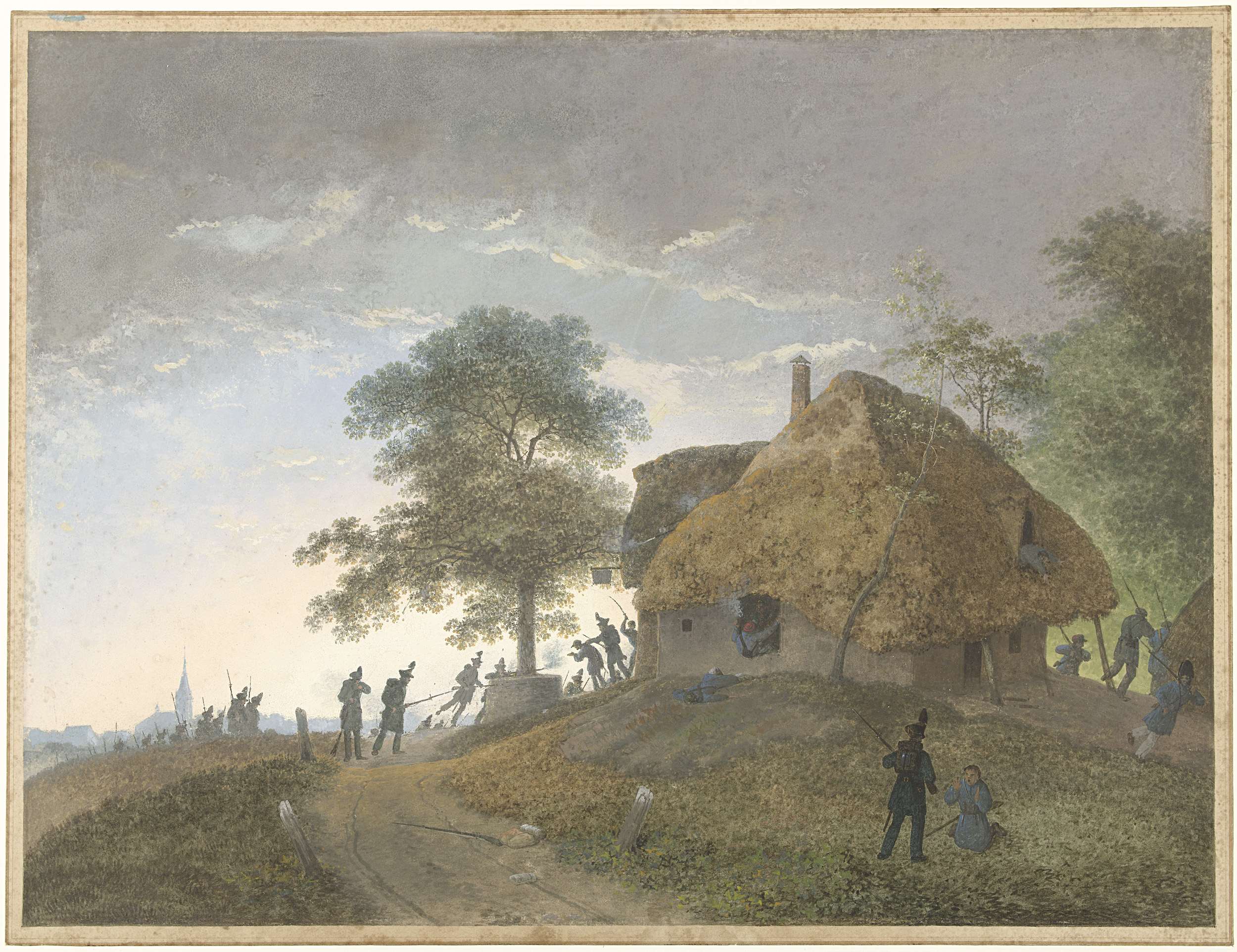 Gevecht bij een herberg of huis met strodak op een h...