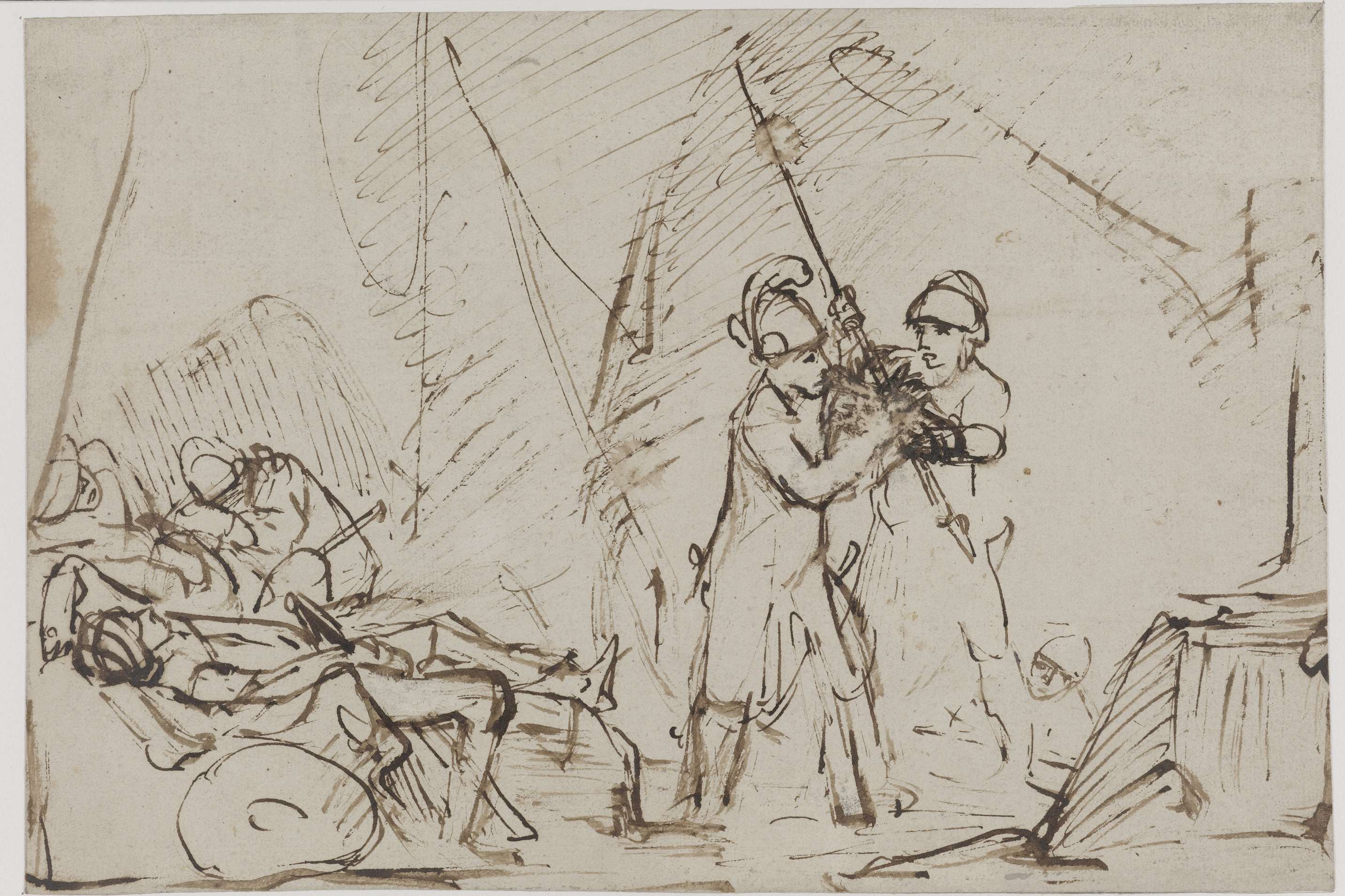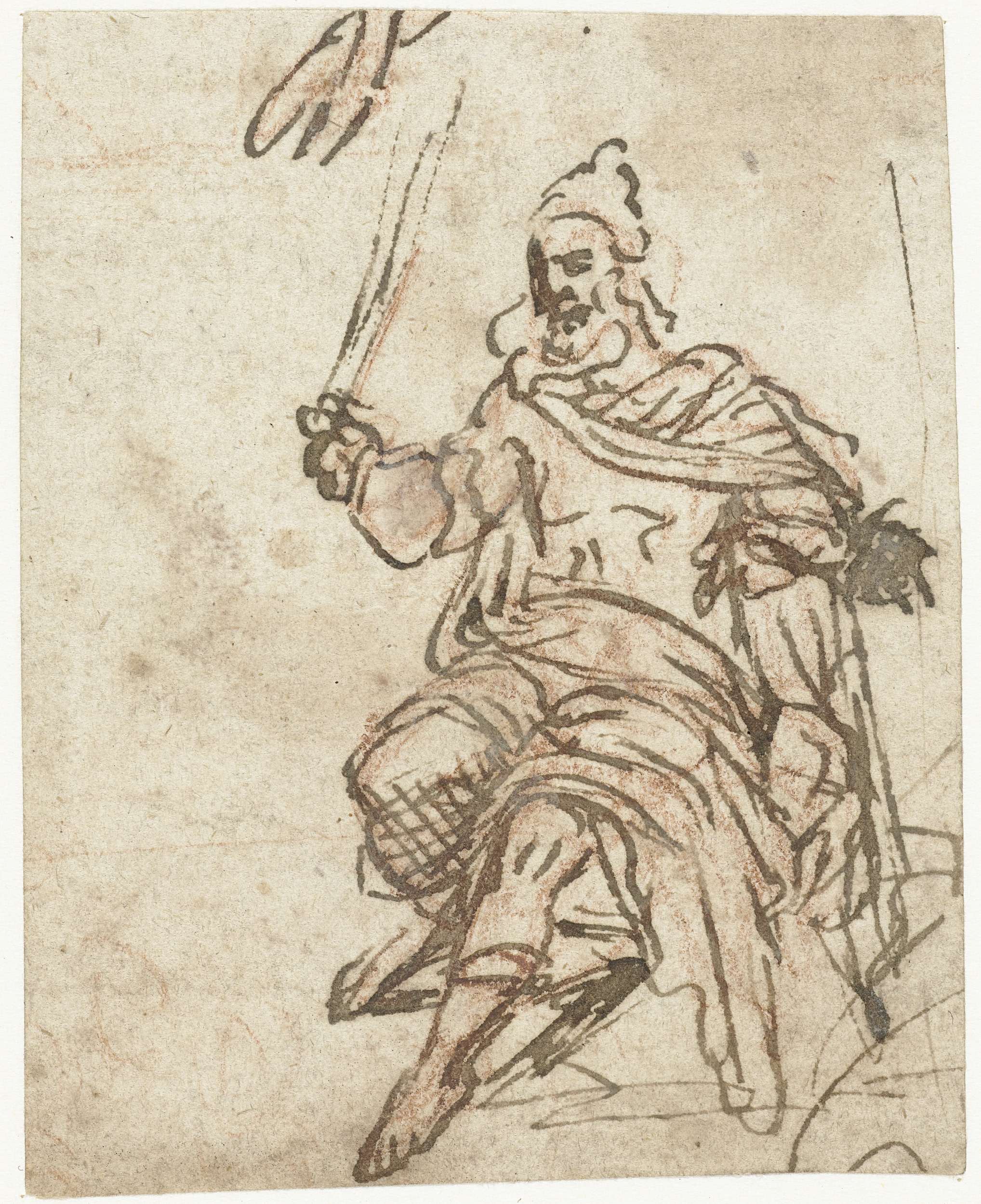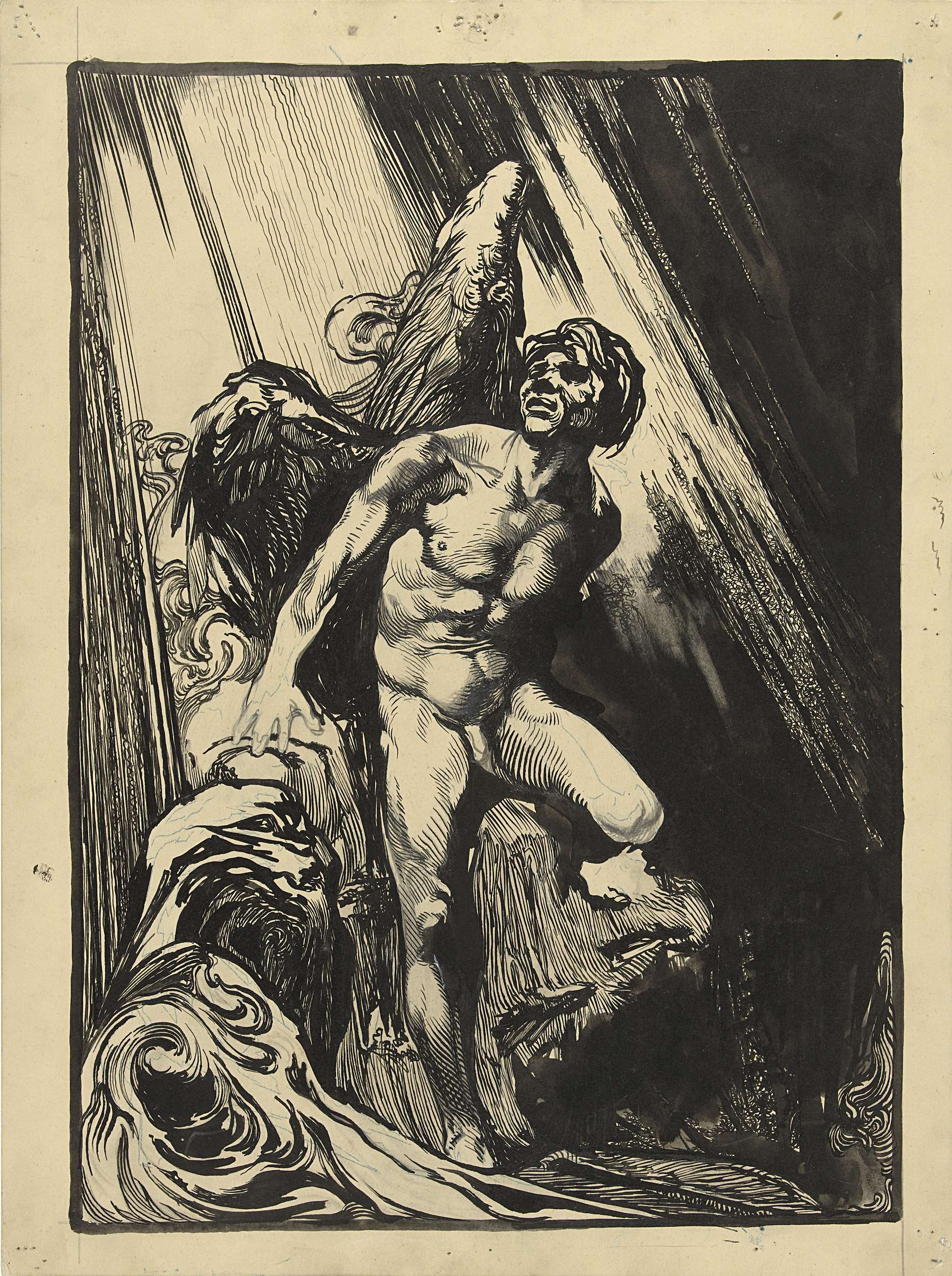 Lucifer in een rotslandschap bij een stroom, opziend...