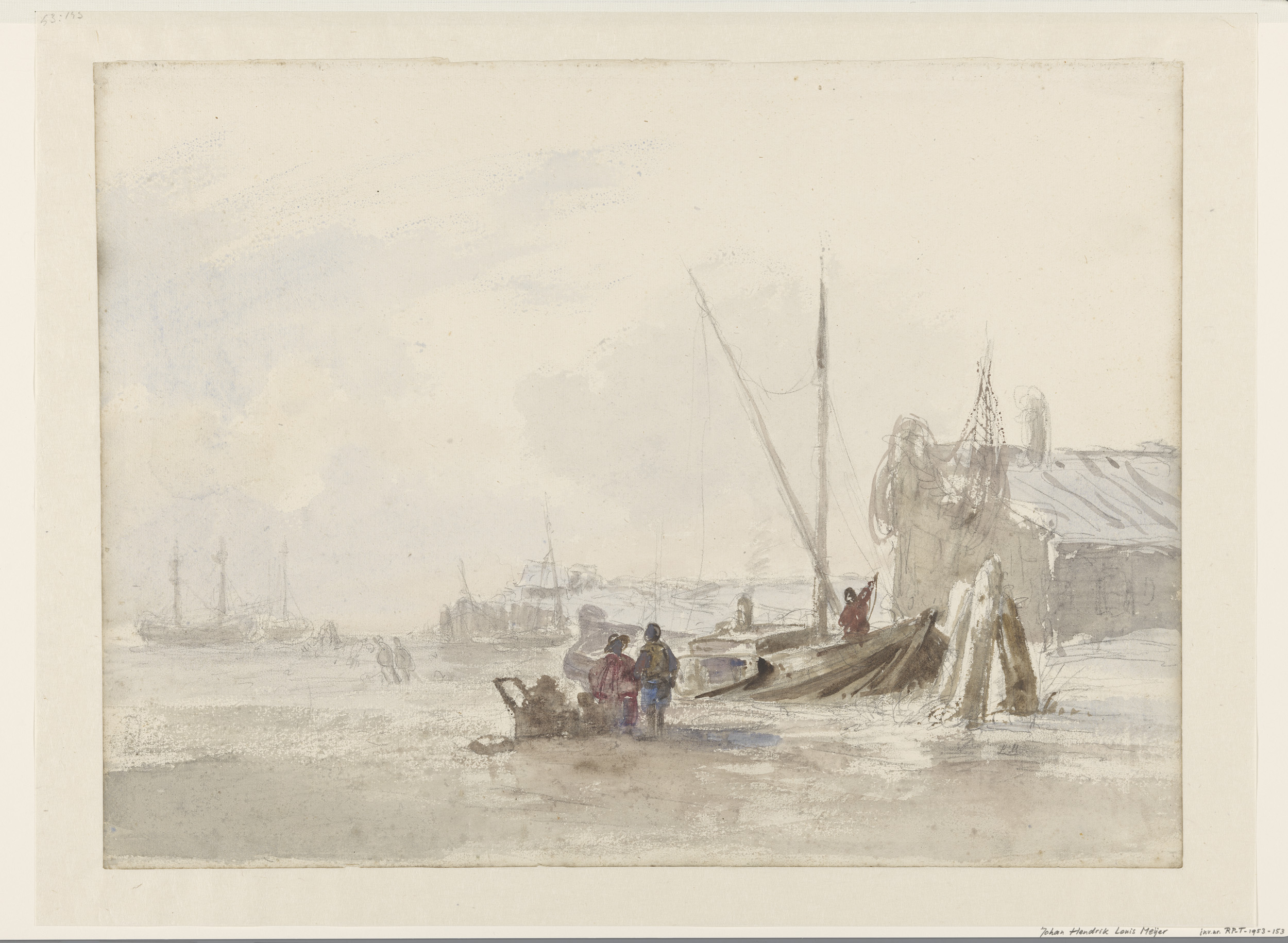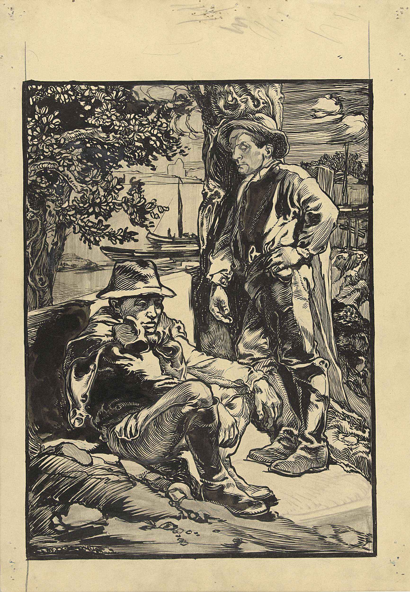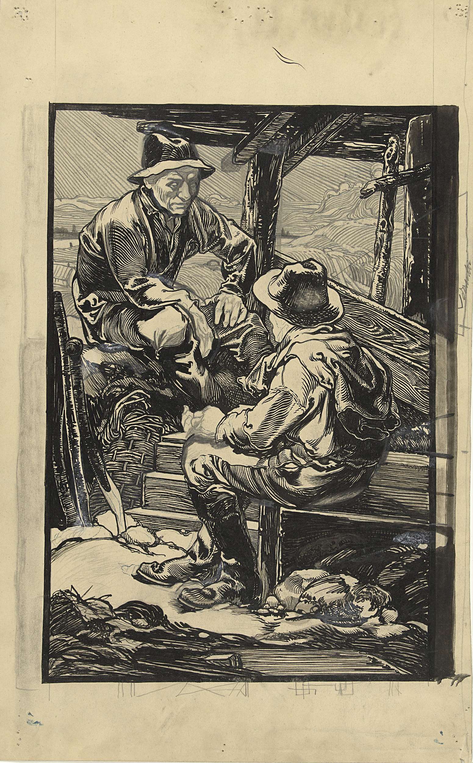 Twee dijkwerkers, de een zittend, de ander tegen een...