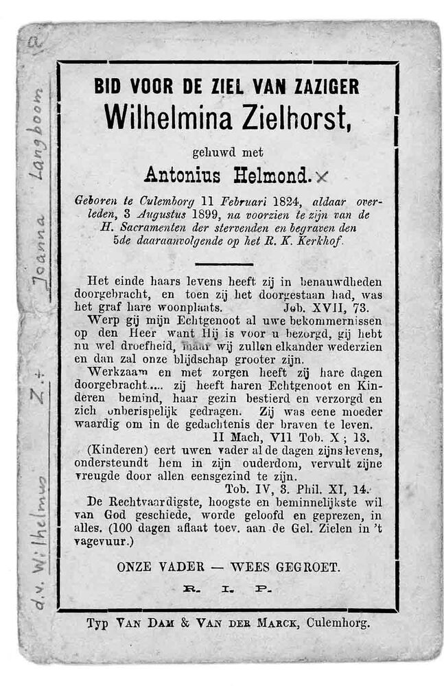 bidprent voor Wilhelmina Zielhorst. Geboren 11-02-18...