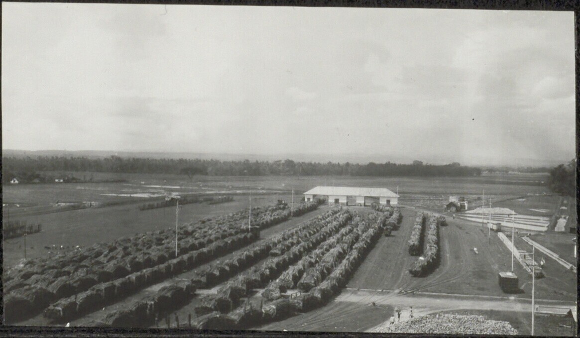 Uitzicht over het terrein van een suikerfabriek met ...
