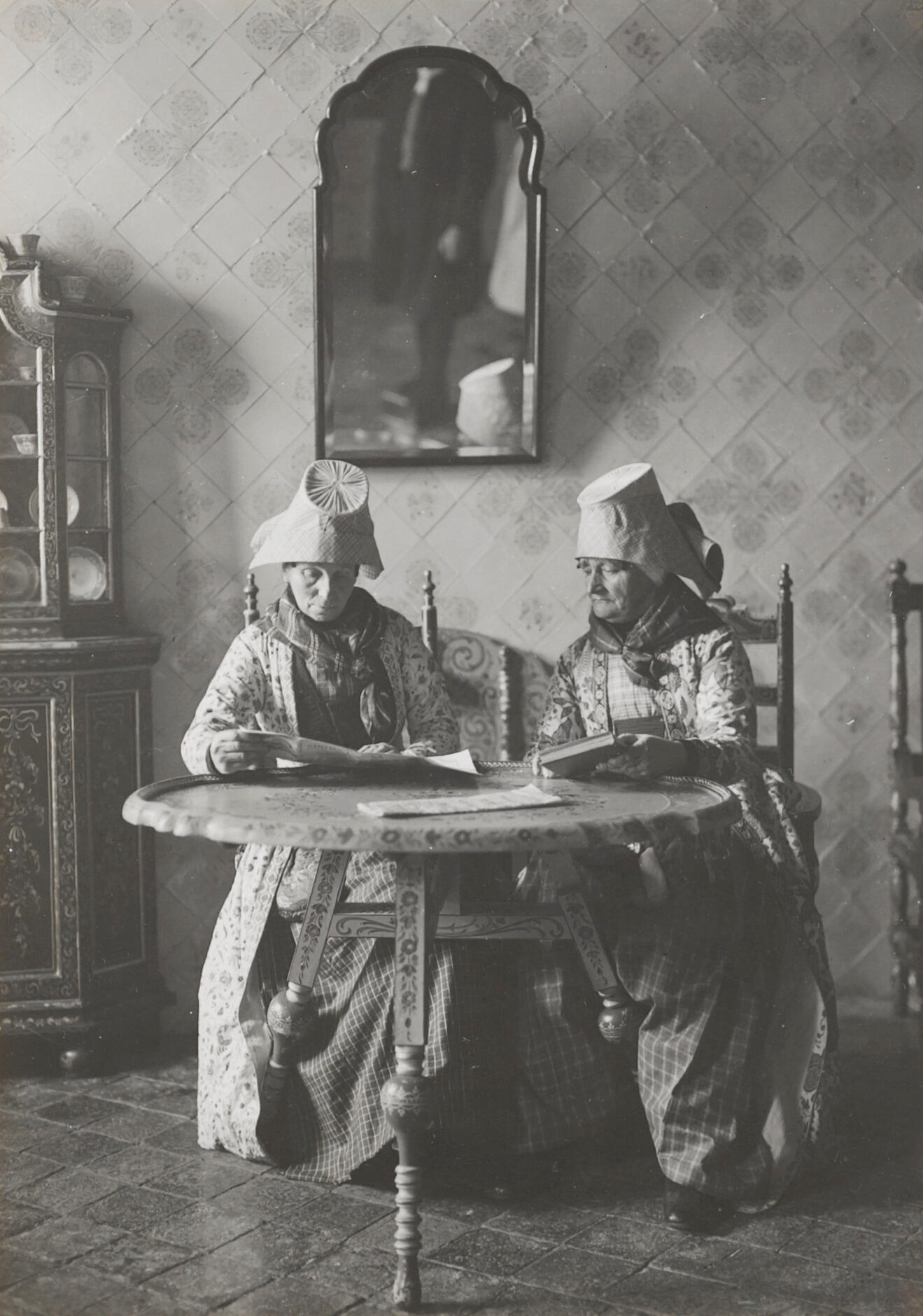 Twee vrouwen, verkleed in streekdracht van Hindeloop...