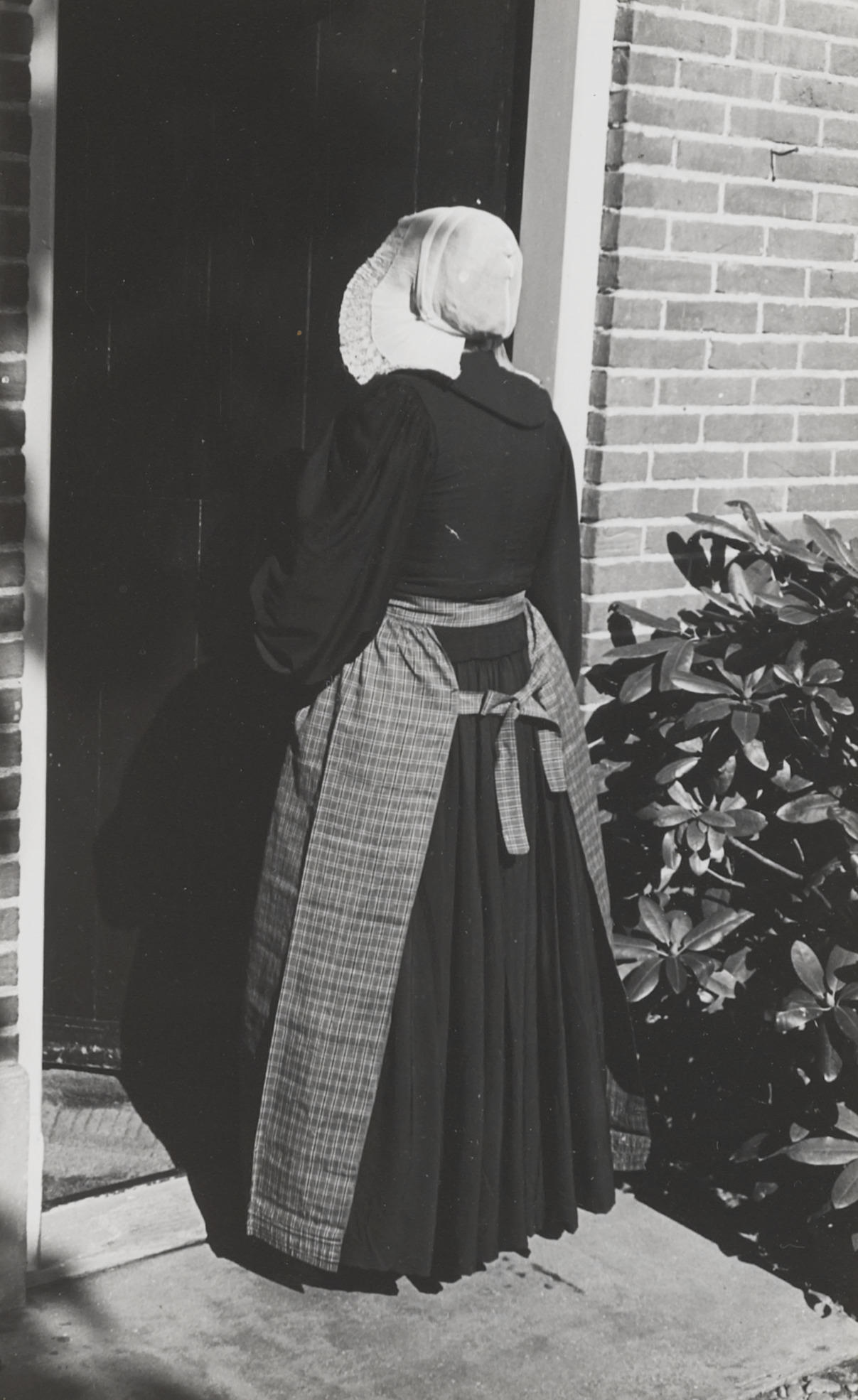 Vrouw in streekdracht, Huizen, 1945 (zwart-wit foto)