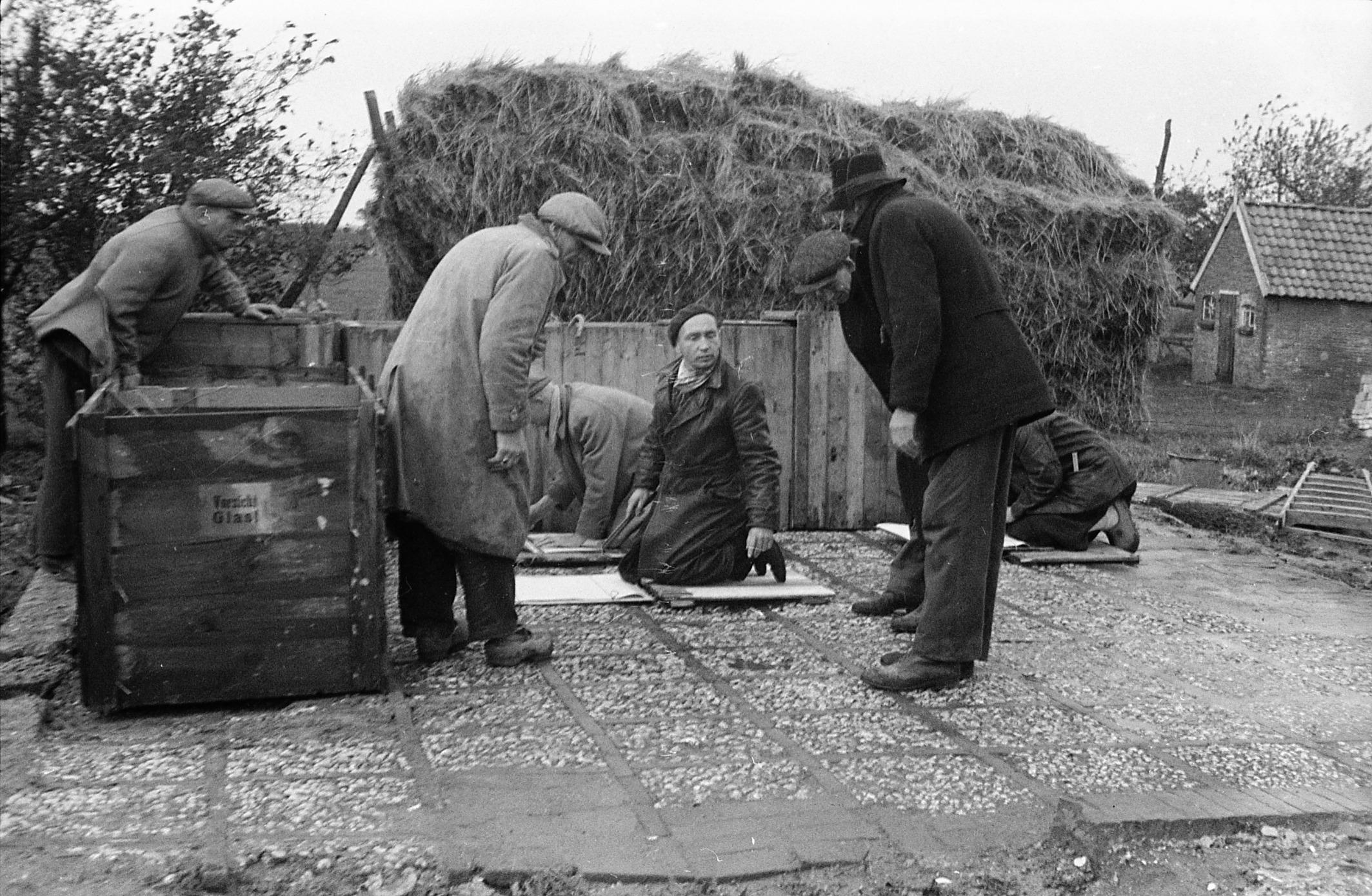 Opmeten van een keitjesvloer, Geesteren, 1945 (zwart...