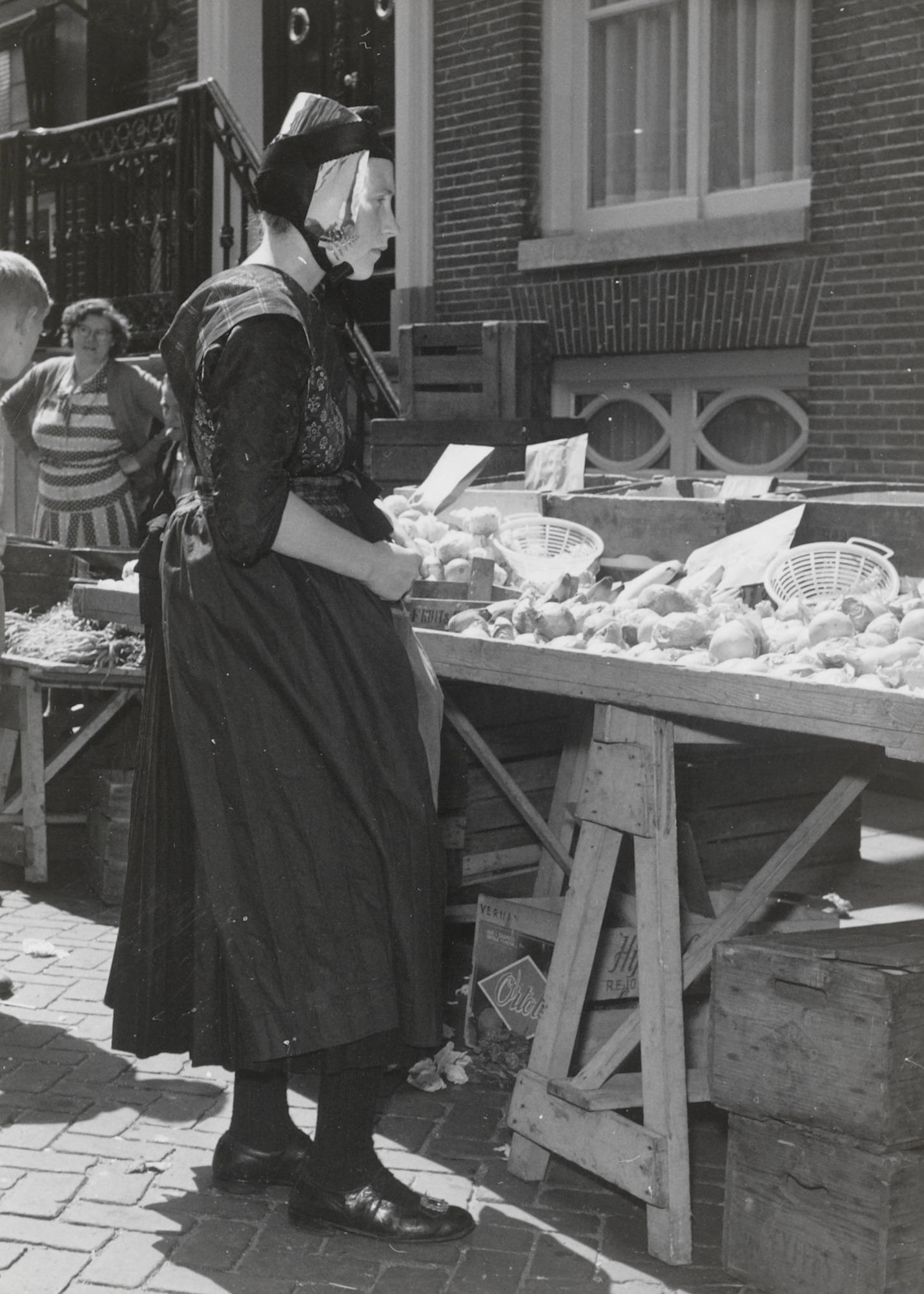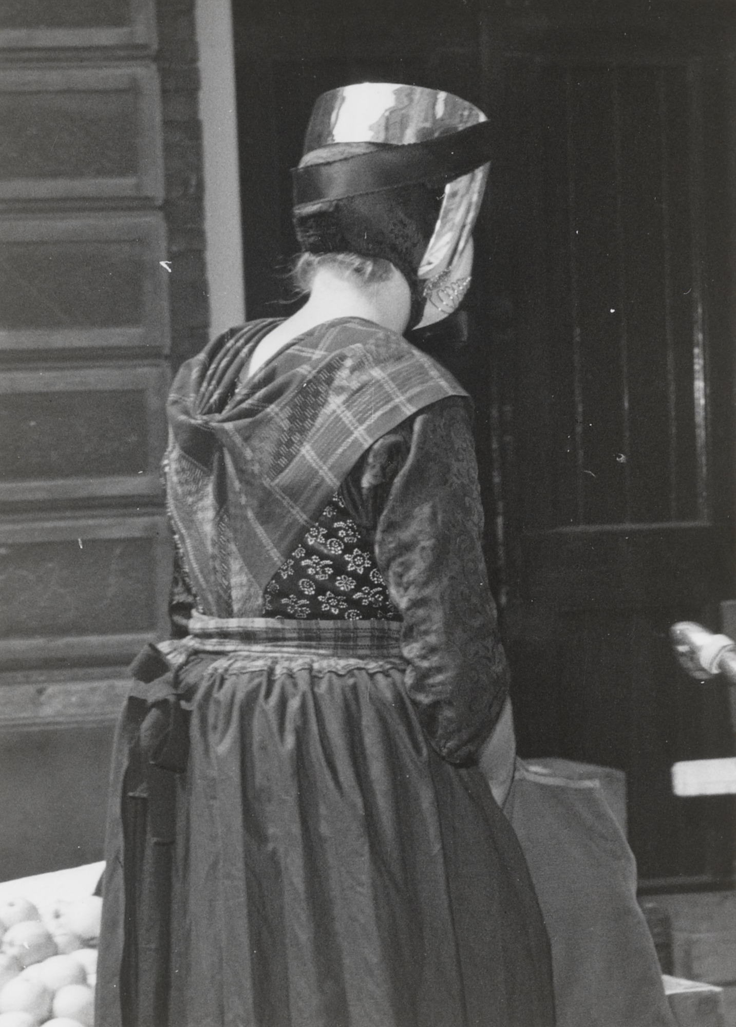 Vrouw in Staphorster dracht op de markt, Meppel, 196...