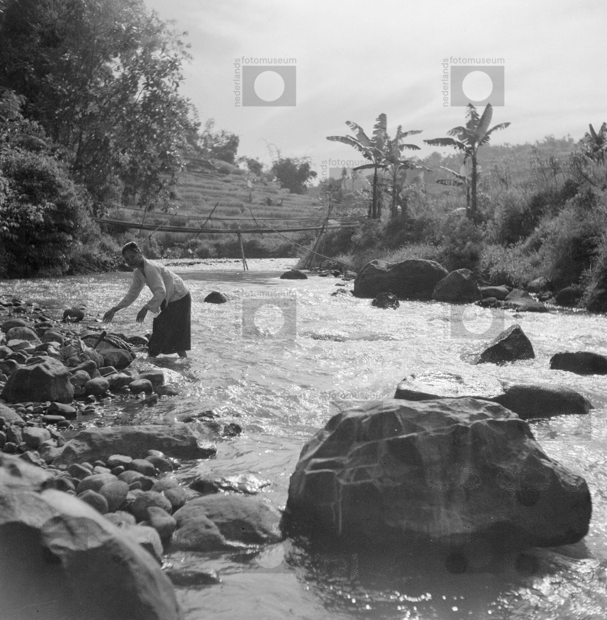 Een vrouw doet in een snelstromende rivier haar was,...
