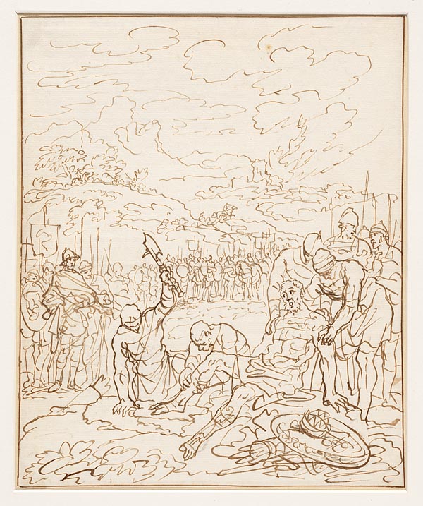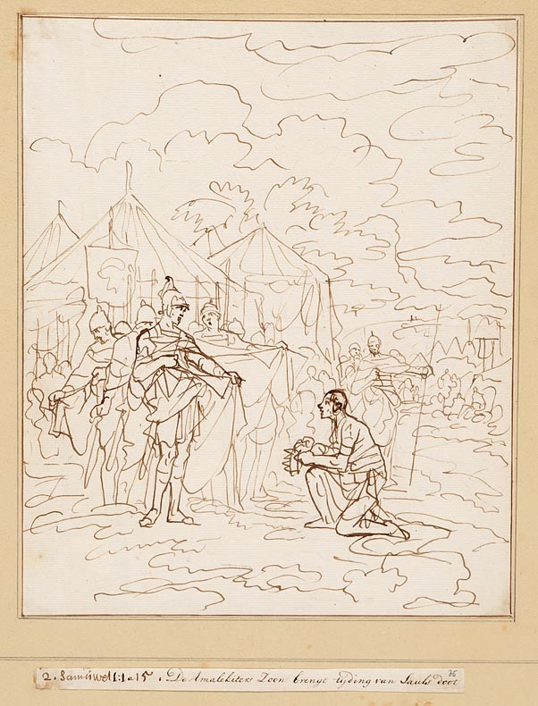 De Amalekiet met Sauls kroon knielt voor David