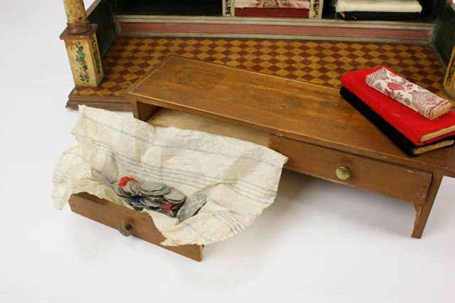 Winkel met stoffen en toonbank, vloer met tegelmotie...