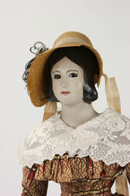 Pop met kleding naar mode 1840 met luifelhoed en man...