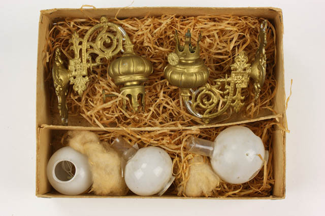Twee lampen met olievat voor aan de wand in doosje m...