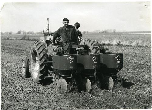 Foto in zwart-wit van een drie-rijige aardappelpootm...