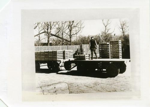 Foto in zwart-wit van een paar aanhangwagens geladen...
