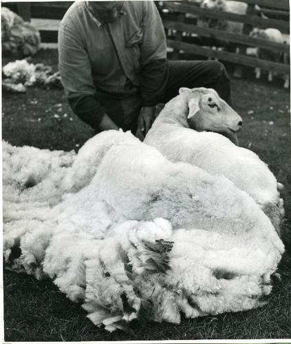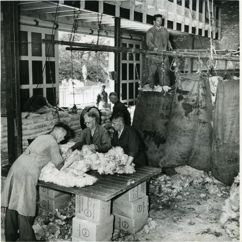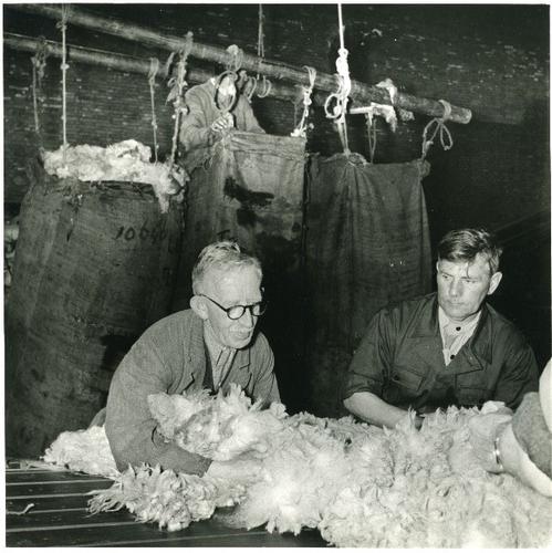 Foto in zwart-wit van drie mannen die schapenvachten...