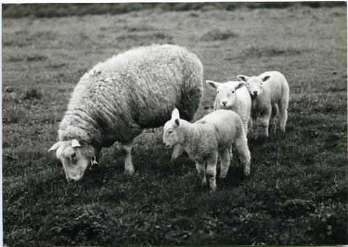 Foto in zwart-wit van een schaap met drie lammeren d...