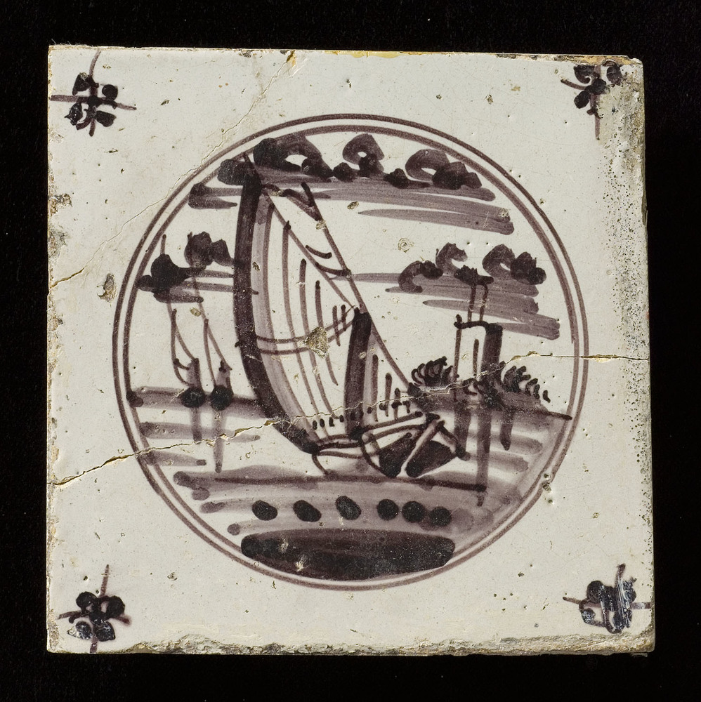Tegel van keramiek, tinglazuur, voorstellende schepe...