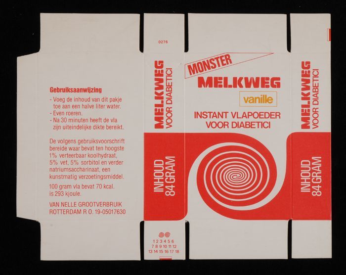 Ongevouwen wit en rood, kartonnen pak "MELKWEG" vla,...