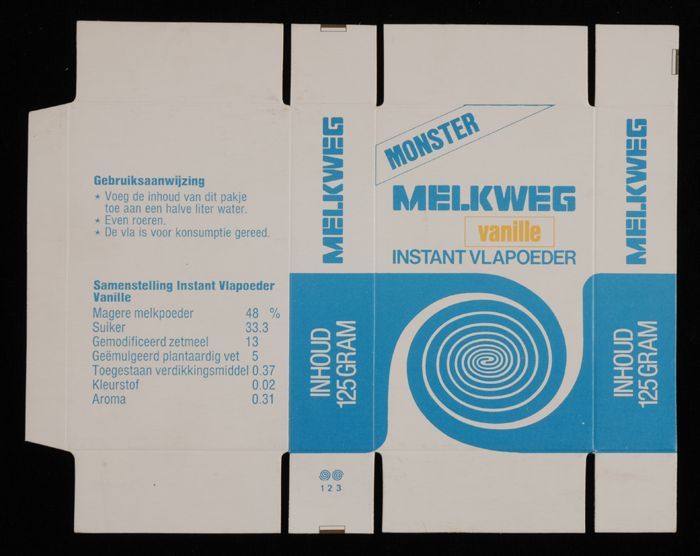 Ongevouwen wit en blauw, kartonnen pak "MELKWEG" vla...