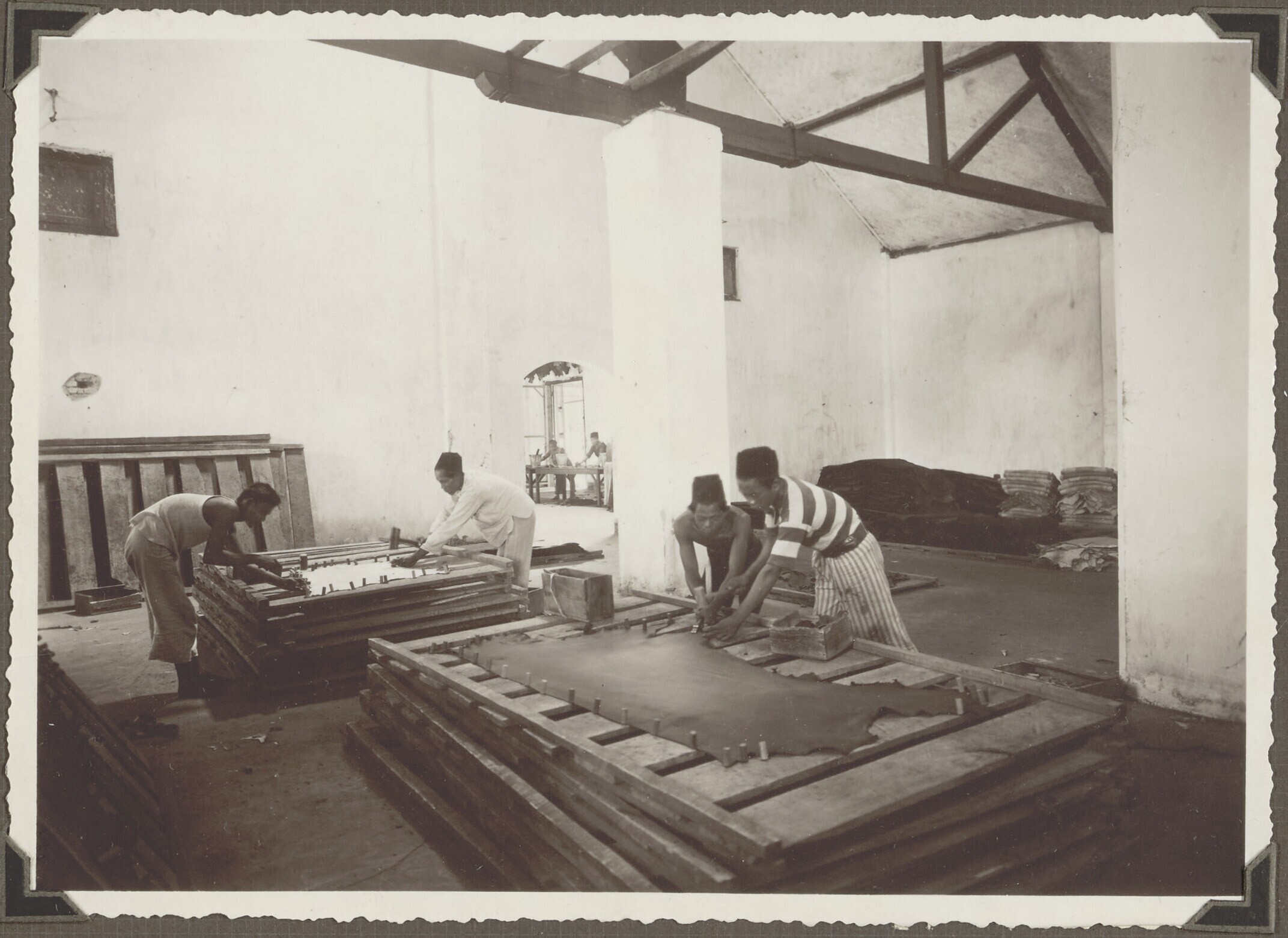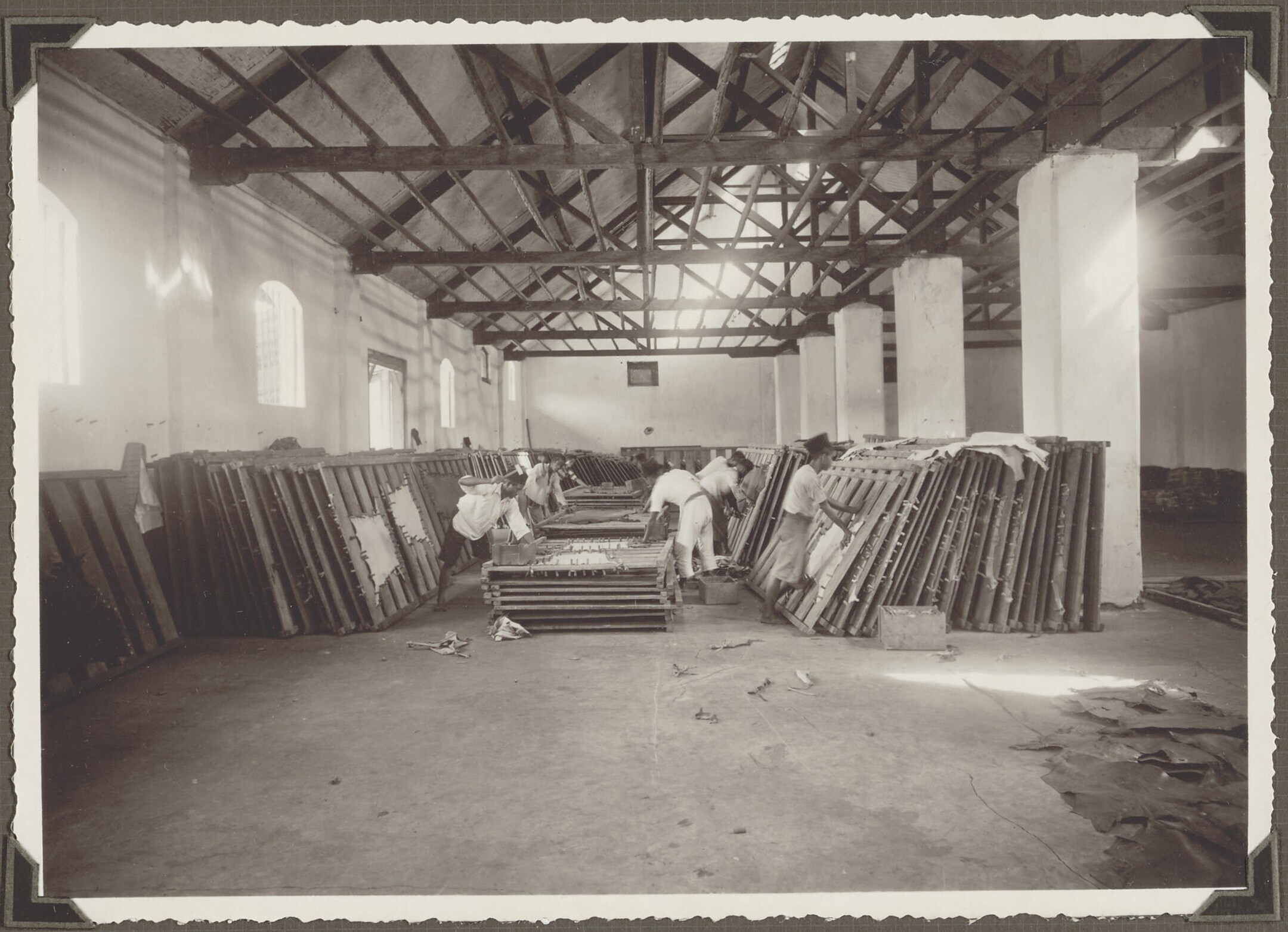 Wet skins being stretched on drying frames at the 'J...