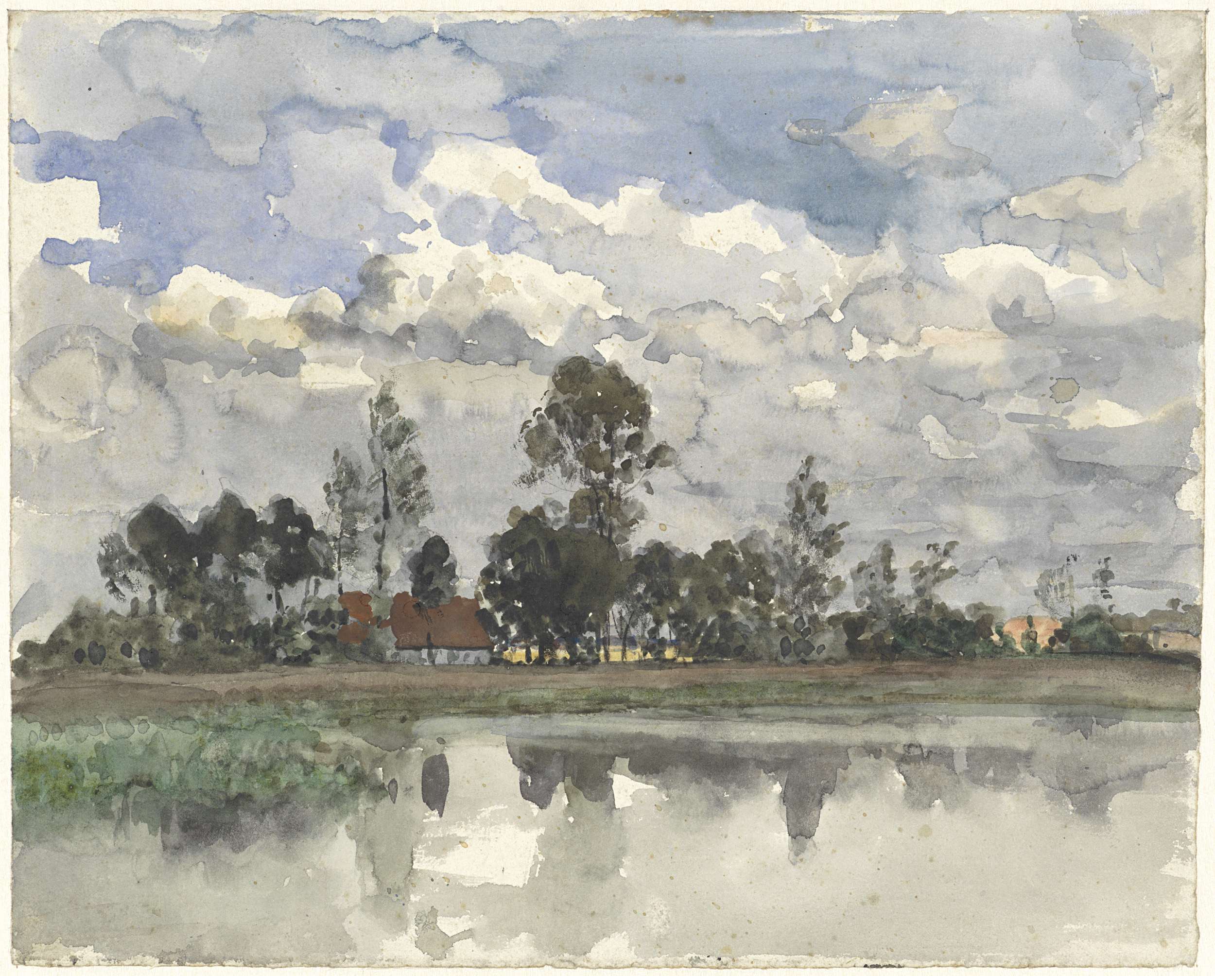 Bomen zich spiegelend in het water bij een bewolkte ...