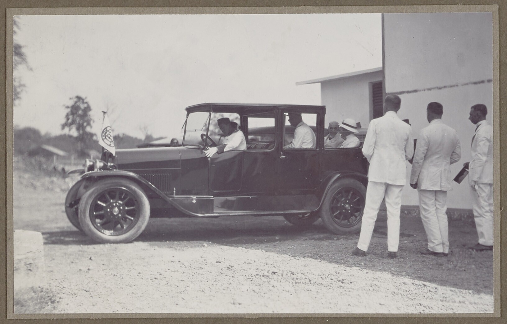 Gouverneur Generaal Fock achter in een auto op bezoe...
