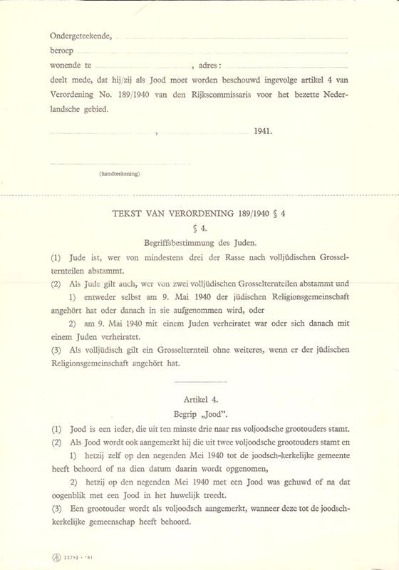 Ambtelijk schrijven, Arierverklaring Verordening 189...