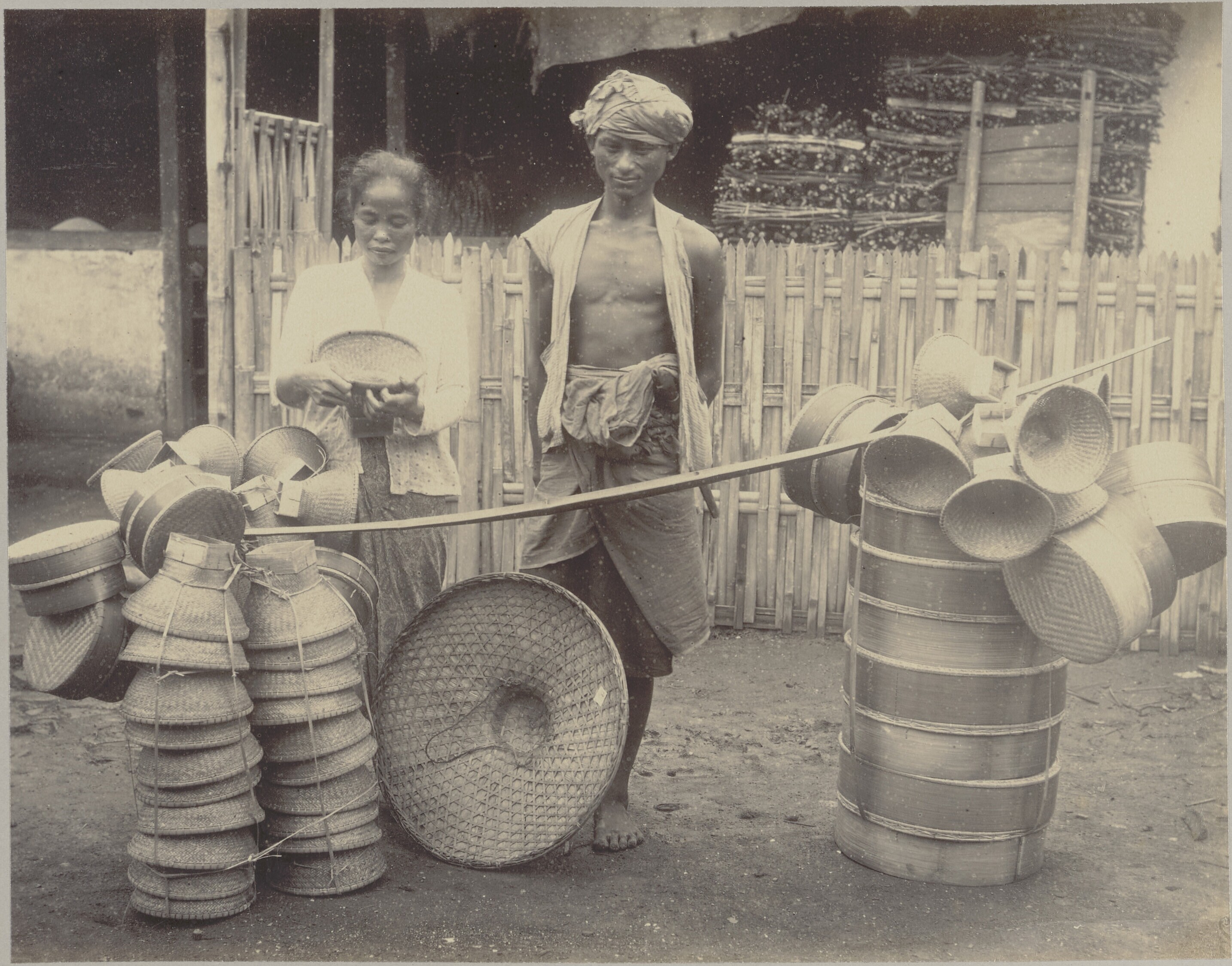 Portret van een mandenverkoper met een klant